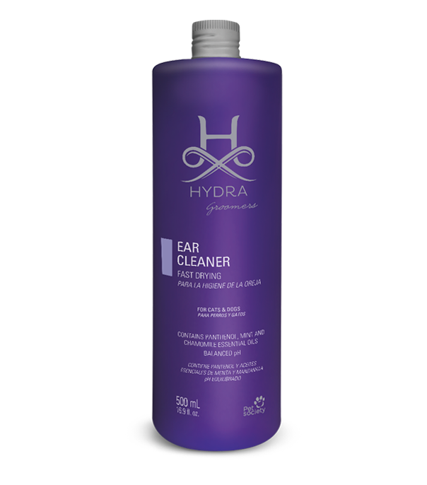 Pet Society Hydra Ear Cleaner is formulated for professional use on dogs and cats for ear hygiene.  This product contains active ingredients that neutralize undesirable odors and remove excess ear secretions.