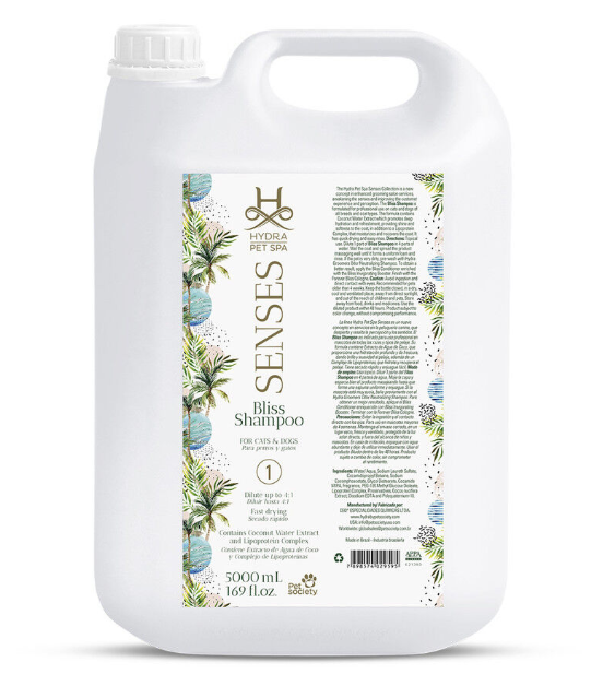 Hydra Pet Spa Senses Bliss Shampoo is formulated for professional use on cats and dogs of all breeds and coat types. The Hydra Dog Shampoo formula contains coconut water extract, which promotes hydration and refreshment, while providing shine and softness to the coat. In addition, a lipoprotein complex moisturizes and helps the coat to recover from styling damage.