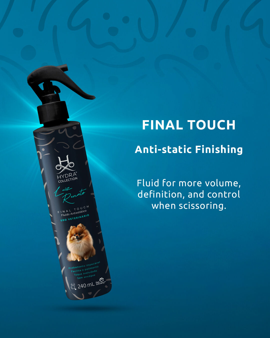 For topical use only. Shake well before use. Bathe the animal with the HYDRA® Collection Luiz Renato line and dry thoroughly. Spray HYDRA® Collection Luiz Renato Final Touch onto the dry coat, comb to style, and proceed with scissor trimming.